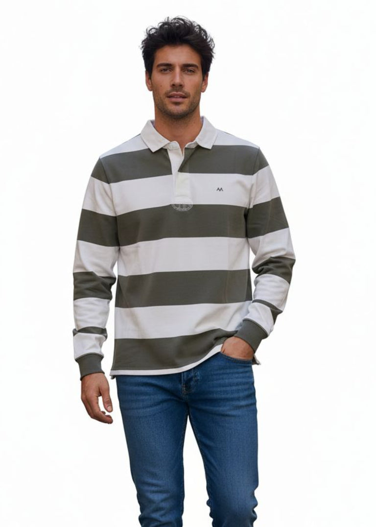 Este polo rugby de rayas, en color verde combina un diseño atemporal con un estilo casual sofisticado. Confeccionado en tejido resistente y cómodo, destaca por su cuello estructurado y su ajuste perfecto, ideal para el día a día. Una prenda versátil que aporta personalidad y elegancia relajada a cualquier look.